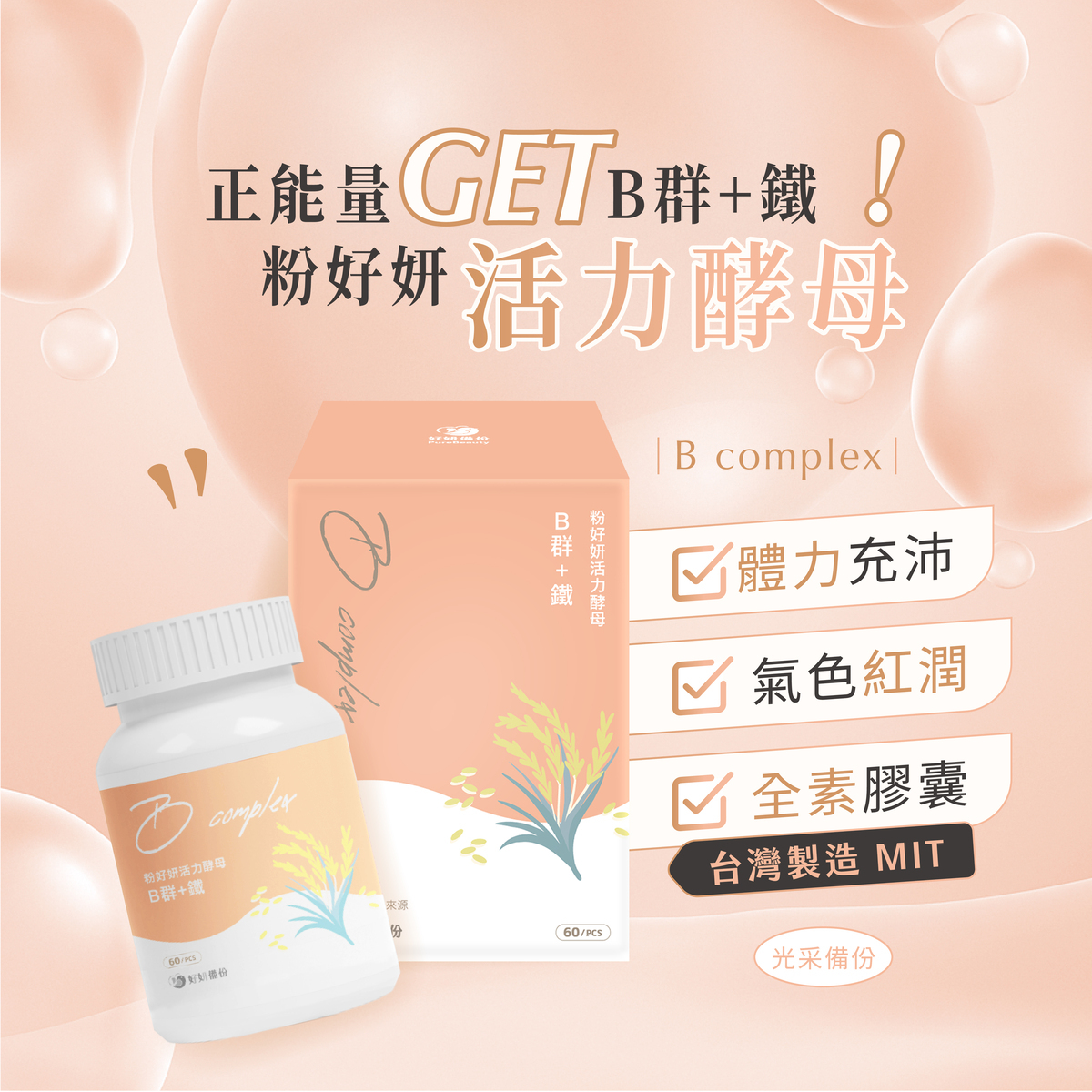 輕鬆補充一天所需的鐵,只要每天2粒粉好妍活力酵母B群+鐵,全素者也可以食用,正能量get!