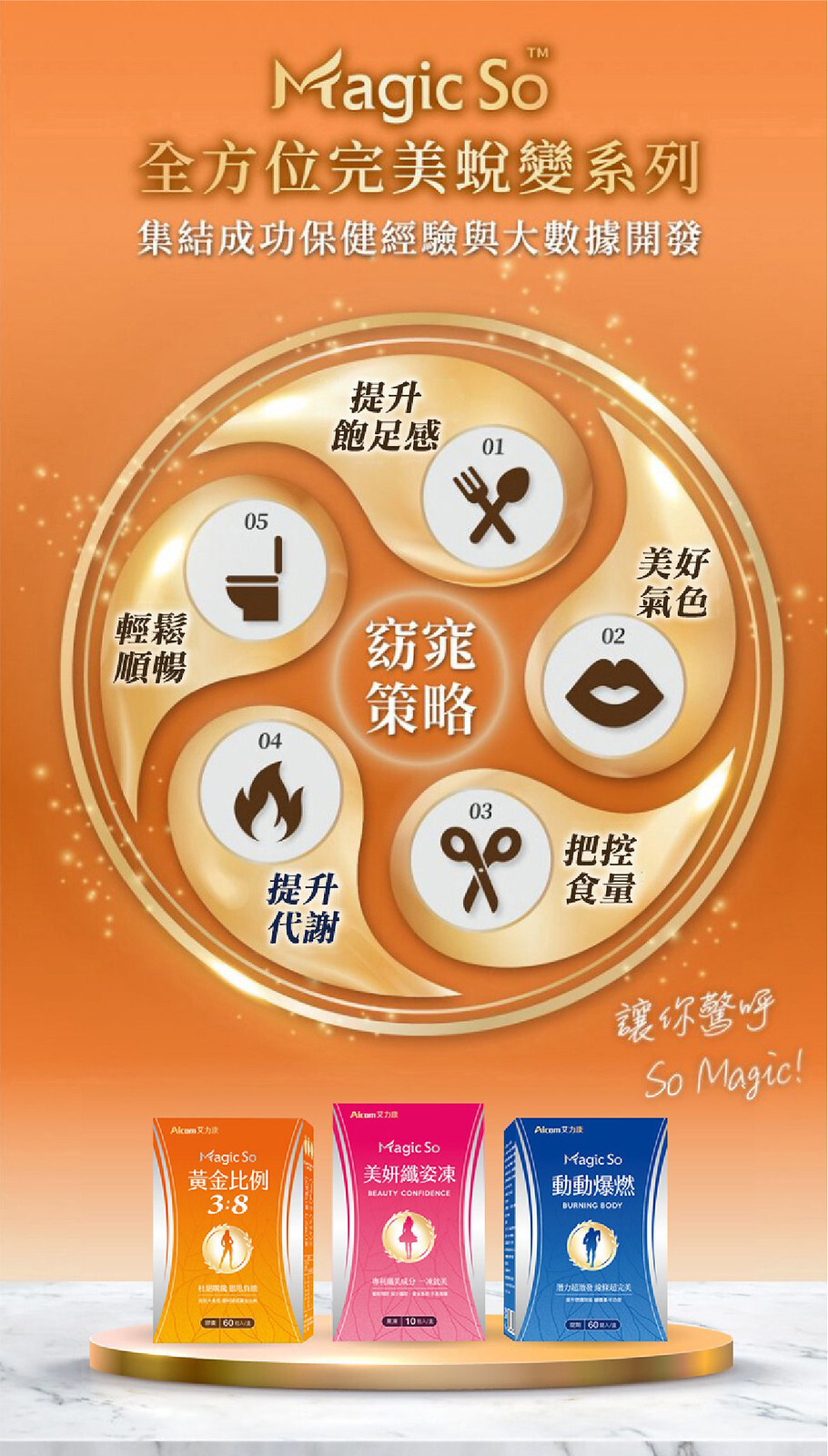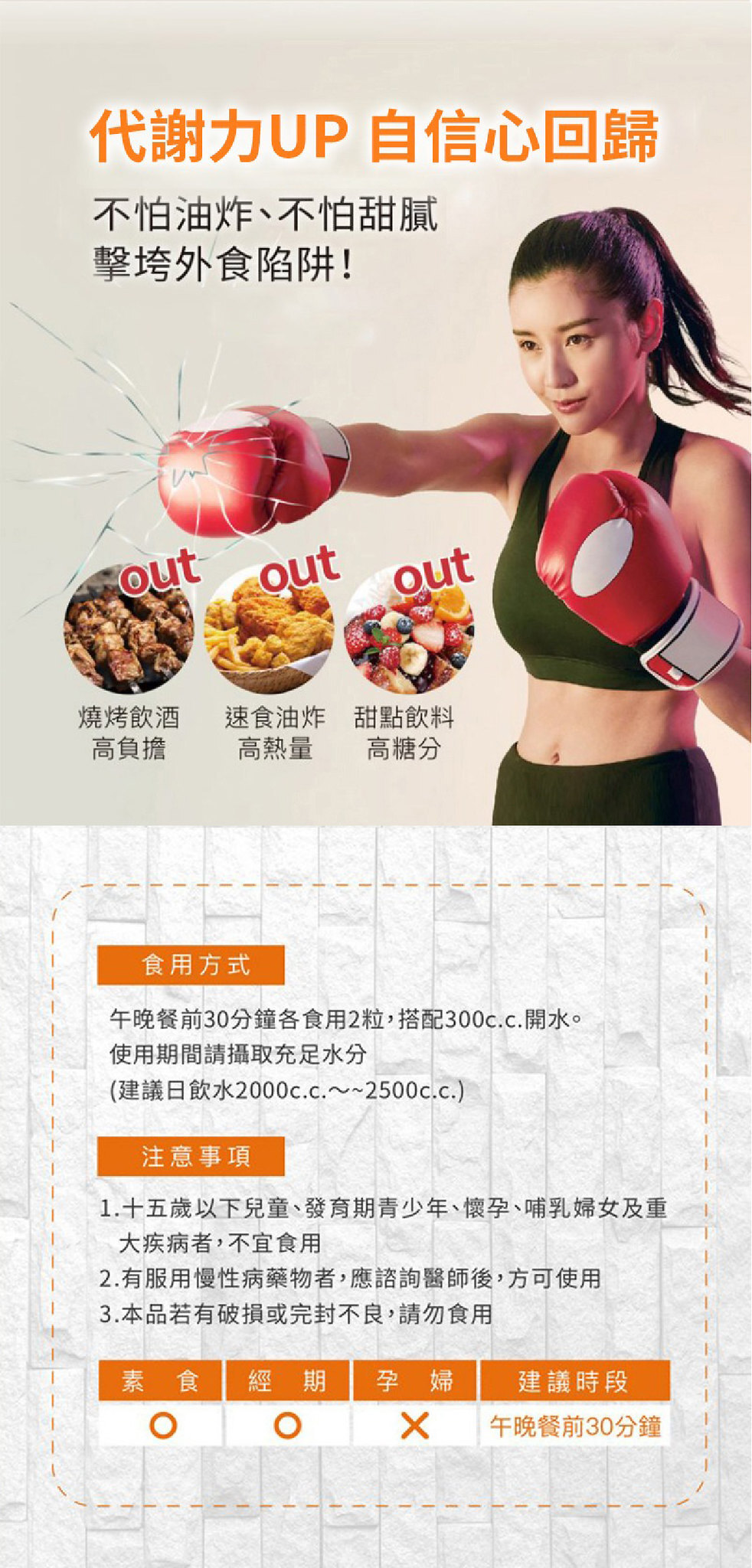 成分:藤黃果萃取物、非洲芒果種子萃取物、山茶花種子萃取物、瓜拿納萃取物、四棱白粉藤萃取物、褐藻萃取物、纖享塑益生菌、黑胡椒鹼、吡啶甲酸銘