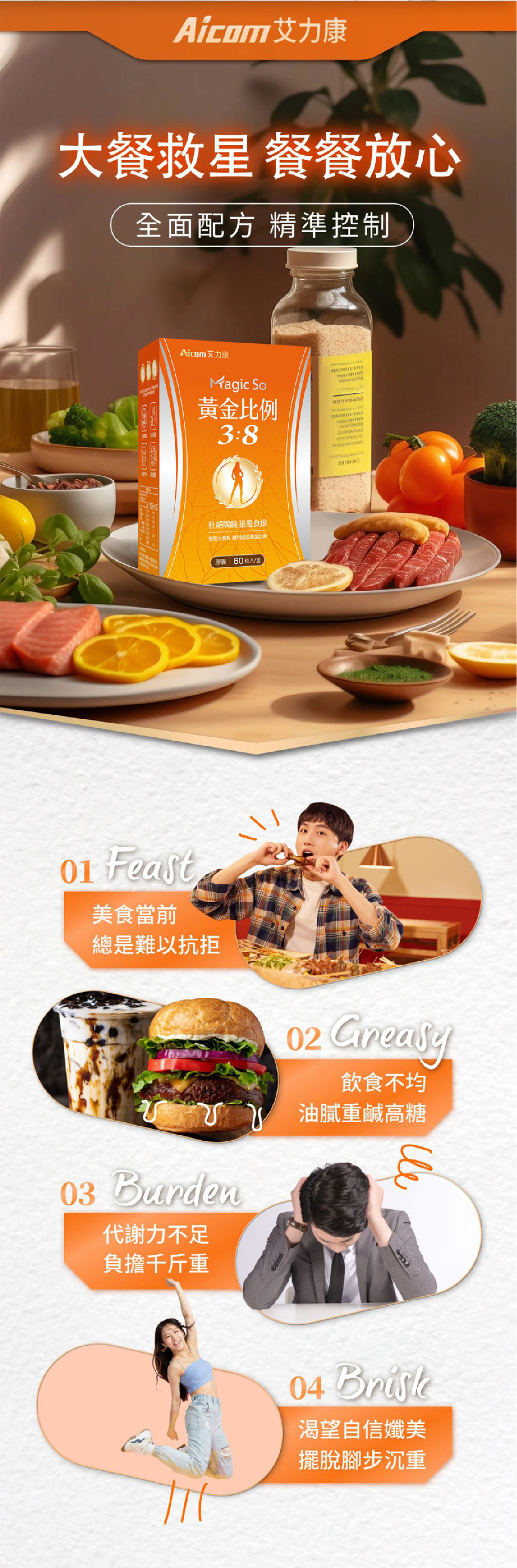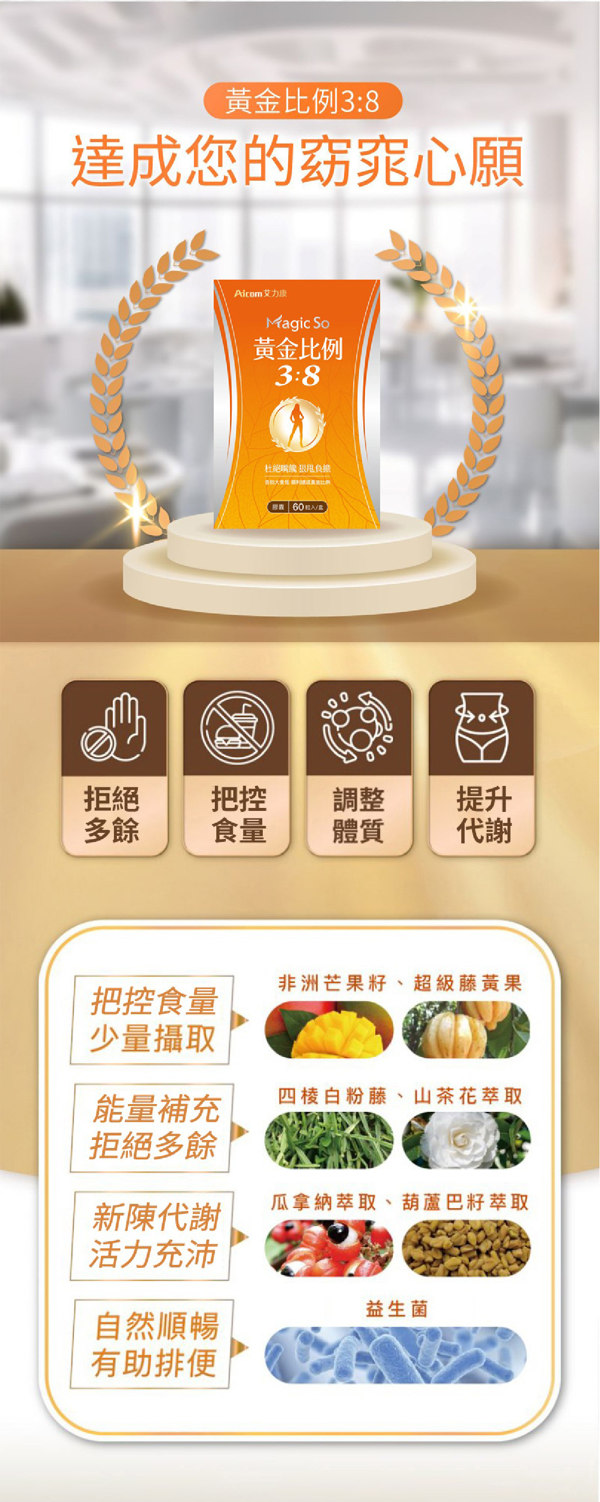 A:每個人體質不同,根據自身狀態和日常飲食習慣,效果也不盡相同。但在適度調整營養攝取 (澱粉少量、糖少量、不喝飲料、不喝酒、不喝茶,蔬菜與蛋白質攝取比例提高) 的情況下,若搭配午、晚餐前30分鐘各兩顆黃金比例3:8,很多顧客回饋是非常有感的。