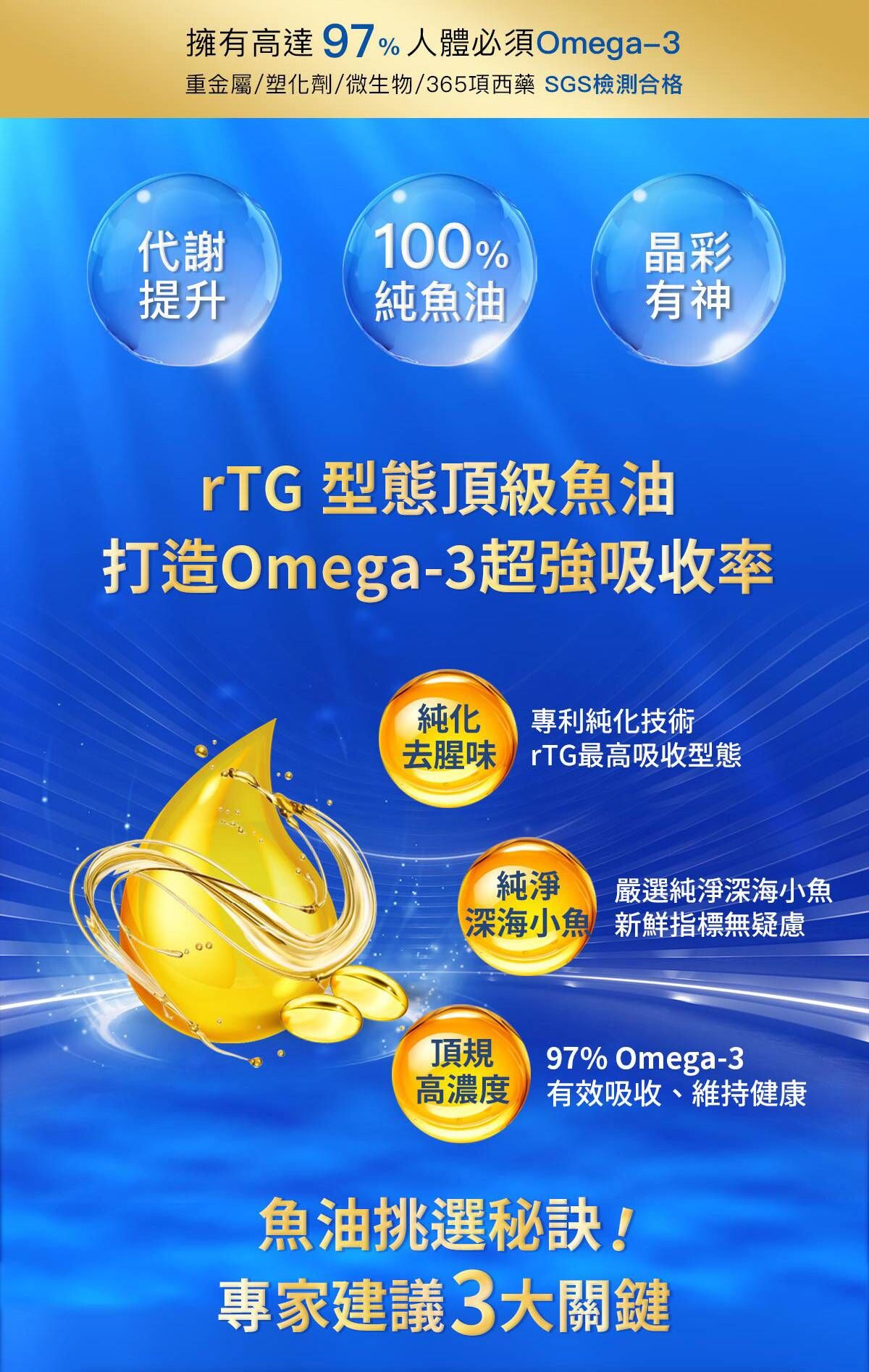 魚體內Omega-3型態大部分是天然的TG型態,好吸收但濃度低(約<30%);酯化加工後可以得到Omega-3濃度更高的EE型態,但吸收率卻不如TG型;rTG型態則是將EE型態魚油經過更高規的再酯化技術轉變回天然的TG型態,獲得最高吸收率且高濃度的頂級魚油。