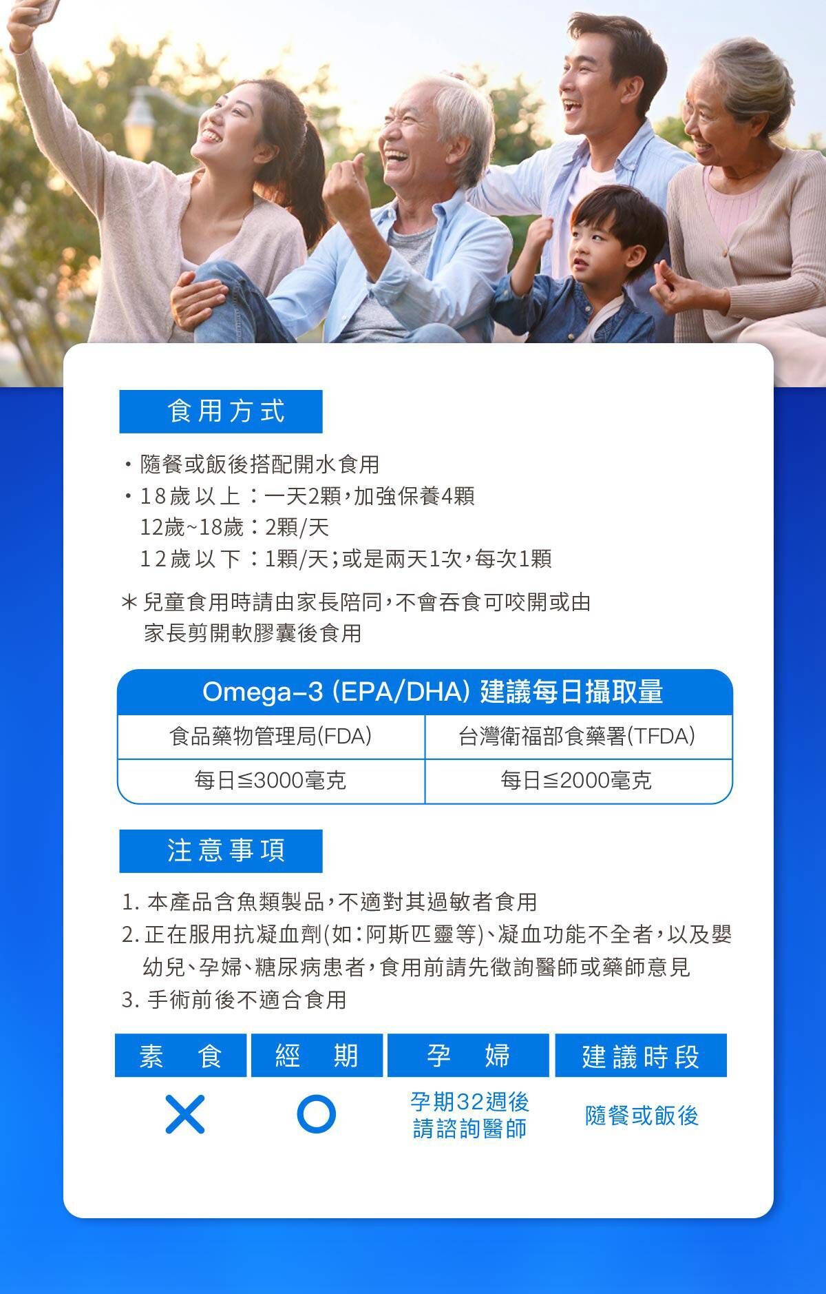 營養標示(2粒/份):熱量12.1大卡,蛋白質0.3公克,脂肪1.1公克,碳水化合物0.1公克,鈉1.3毫克,魚油1200毫克,Omega-3 1080毫克,EPA 480毫克,DHA 480毫克