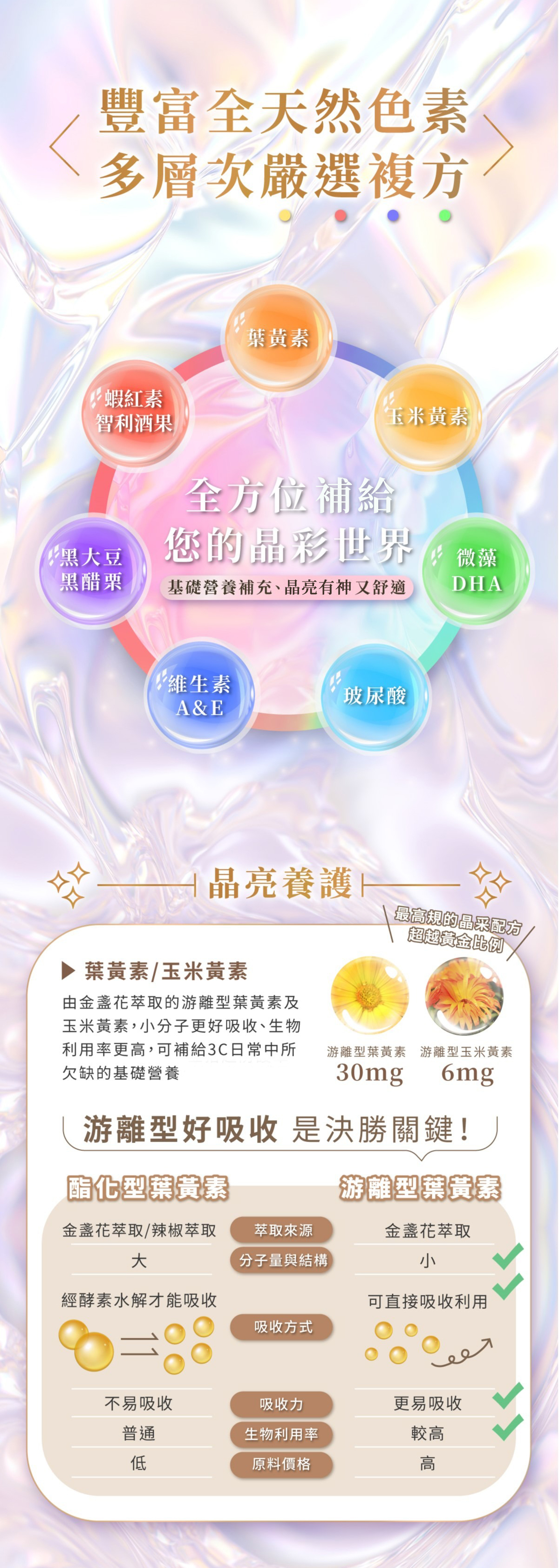 *貼心提醒* 晶彩葉黃素最大的價值來自全面完整的配方,葉黃素本身只是一個很基本的成分而已喔!跟市售普通的單薄葉黃素食品比起來實在是CP值最高的保養聖品~