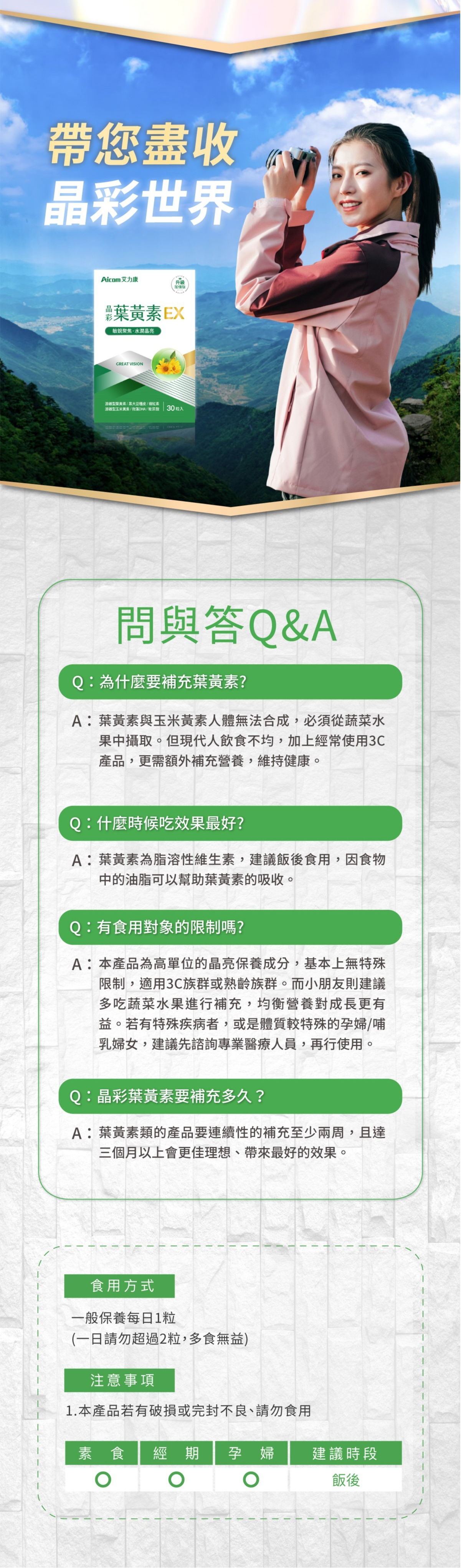 A:晶彩葉黃素裡面的葉黃素萃取自金盞花,一日1粒(30mg,為衛福部建議國人每日攝取之最高劑量),搭配黃金比例的6mg玉米黃素,可以達最佳效果。