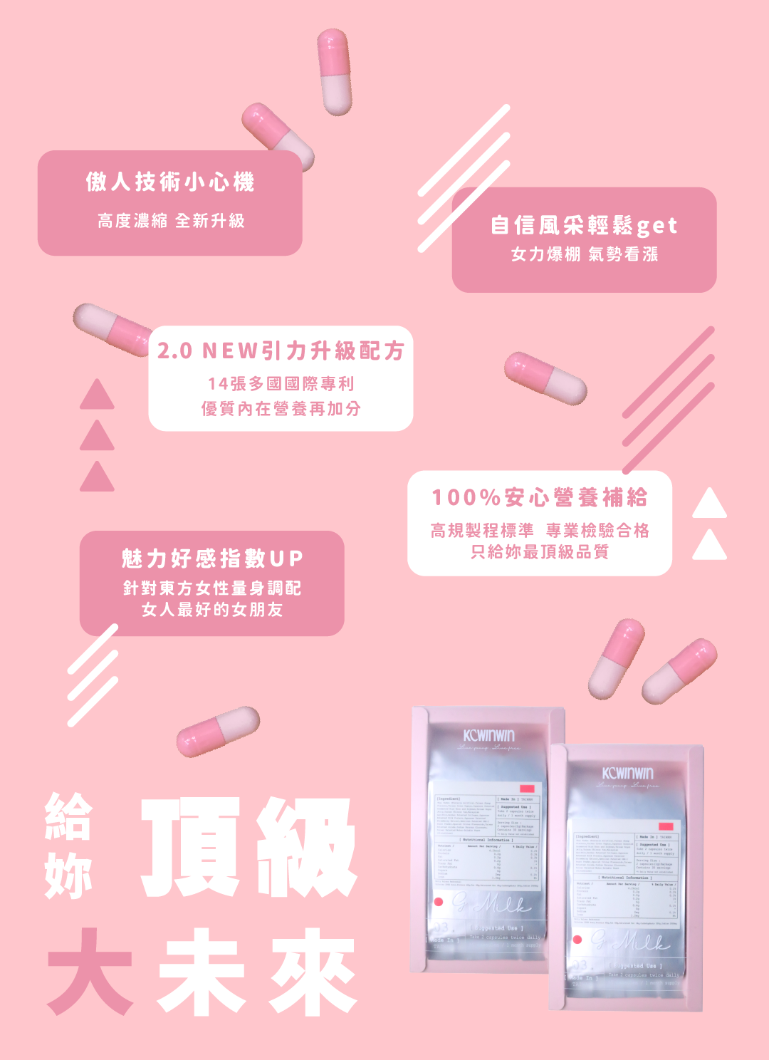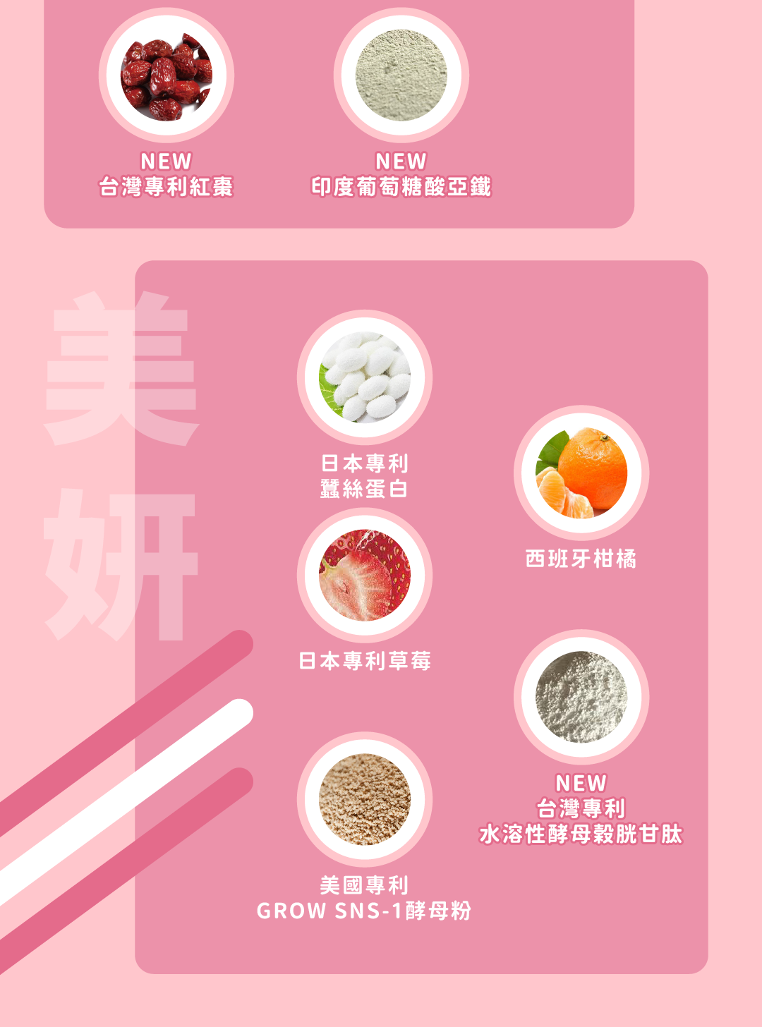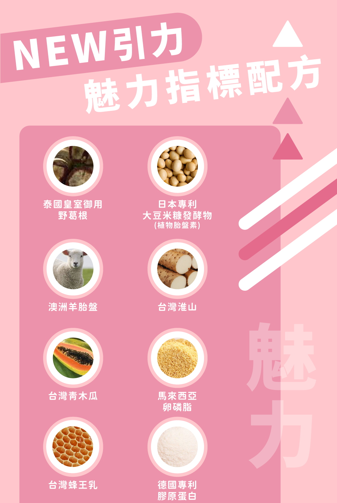 成分: 泰國葛根萃取物、青木瓜萃取物、蠶絲蛋白、大豆米糠發酵物(植物胎盤素)、膠原蛋白、羊胎盤乾燥粉末、蜂王乳萃取物、珍珠粉(專利製程)、淮山萃取物、枸杞萃取物、卵磷脂、柑橘萃取物(含柑橘類黃酮)、美國 GROWSNS-1 酵母粉、日本專利草莓萃取物、石榴萃取物