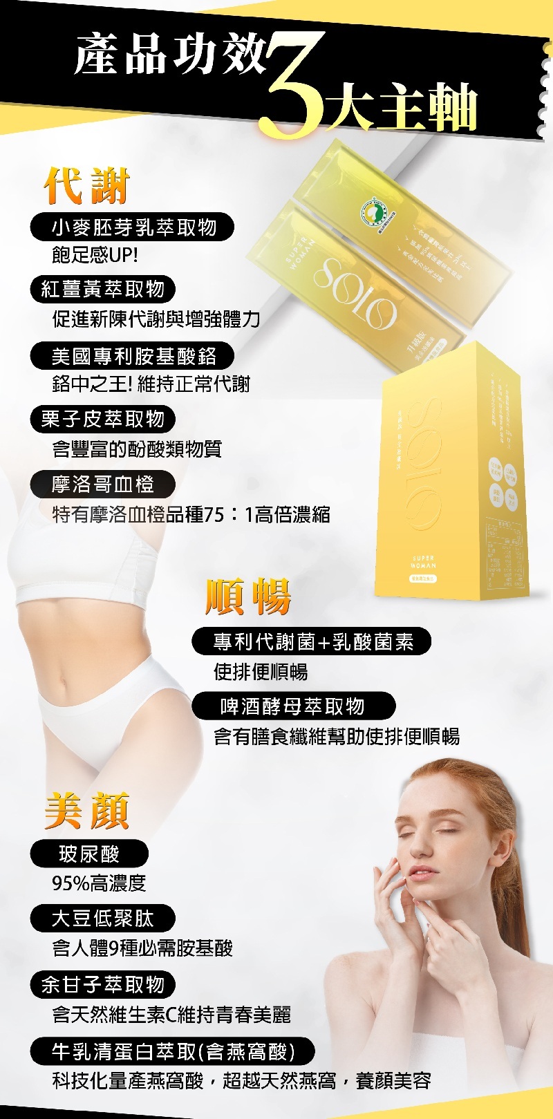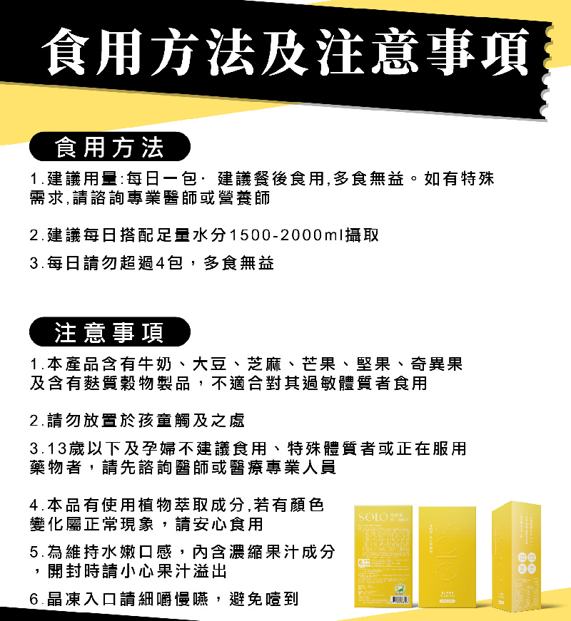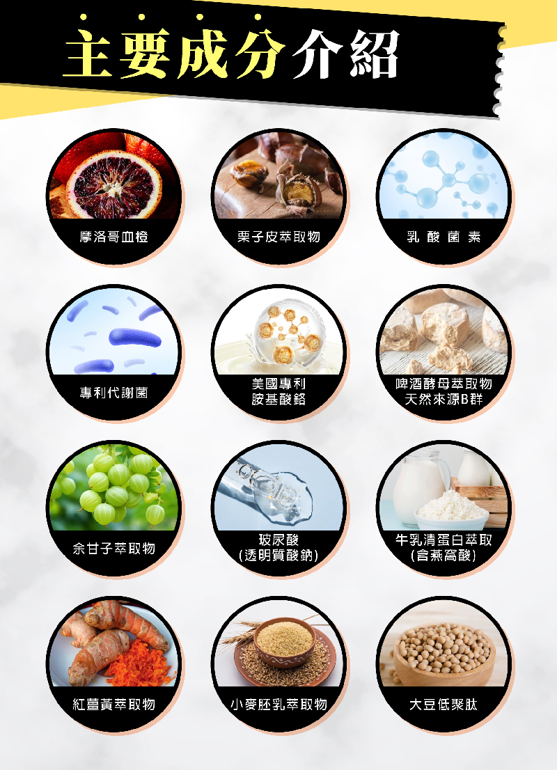 成分:純水、果糖、濃縮綜合莓果汁、玉米來源可溶性纖維、阿拉伯糖、綜合蔬果酵素粉(決明子、昆布、裙帶菜、紫菜、香菇、檸檬馬鞭草、苦艾、西番蓮、金盞草、大飛揚草、牛筋草、檸檬草、大茴香、馬黛茶、魚腥草、紫蘇、薰衣草、貓薄荷、洋甘菊、生薑、益母草、芭樂葉、丁香、咸豐草、迷迭香、燕麥片、玉米、大麥、豌豆、紅豆、薏仁、芝麻、刺槐豆、小米、大豆、爆裂玉米、黑麥、黑豆、鷹嘴豆、扁豆、糙米、鳳梨、香蕉、蘋果、木瓜、芭樂、哈密瓜、酪梨、梅子、西印度櫻桃、檸檬、葡萄乾、芒果、楊桃、西瓜、腰果、核桃、奇異果、西洋梨、巴西莓、卡姆果、萊姆、玫瑰果、橘子、樹莓、柳橙、水蜜桃、蘿蔔、高麗菜、蓮藕、牛蒡、菊苣、甘藷、南瓜、木薯、番茄、羽衣甘藍、青椒、紅甜菜、胡蘿蔔、長型南瓜)、專利余甘子萃取物、芹菜萃取物、蒟蒻精粉、鹿角菜膠、刺槐豆膠、流行鏈球菌發酵物(含透明質酸鈉)、啤酒酵母萃取物 (含維生素B群)、牛奶萃取物(含燕窩酸)、大豆低聚肽、專利小麥胚芽乳萃取物、乳酸菌肽(L. acidophilus as tyndallized killed bacterial)、紅薑黃萃取物、血橙萃取物(摩洛哥血橙濃縮粉、麥芽糊精)、專利栗子皮萃取物、專利複合乳酸菌、專利吡啶甲酸鉻、香料、檸檬酸、檸檬酸鈉、氯化鉀、蔗糖素(甜味劑)