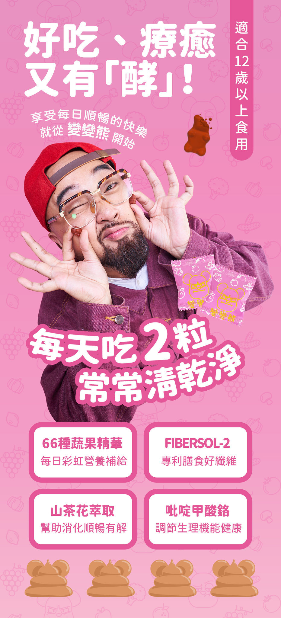 成分: 麥芽糖醇(甜味劑)、明膠、難消化性麥芽糊精、香料、DL-蘋果酸、檸檬酸、濃縮酵素粉、食用光亮劑(棕櫚蠟、棕櫚油、棕櫚核仁油)、 綜合維生素(麥芽糊精、維生素C、菸鹼醯胺、維生素E、泛酸鈣、維生素D、維生素B2、維生素B6、維生素B1、維生素A、葉酸、生物素、維生素B12)、 綜合蔬果發酵粉(綜合蔬果發酵物…等)、山茶花萃取、吡啶甲酸鉻、食用黃色五號、食用黃色四號、食用紅色四十號