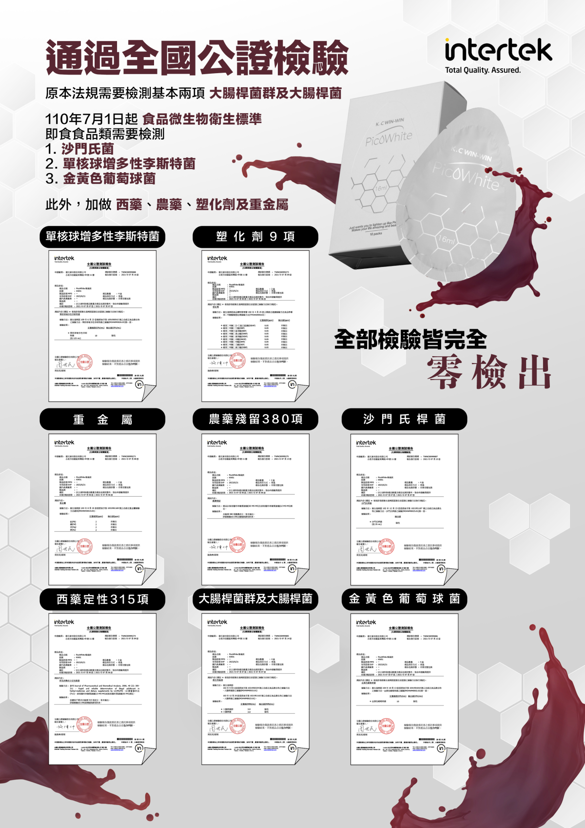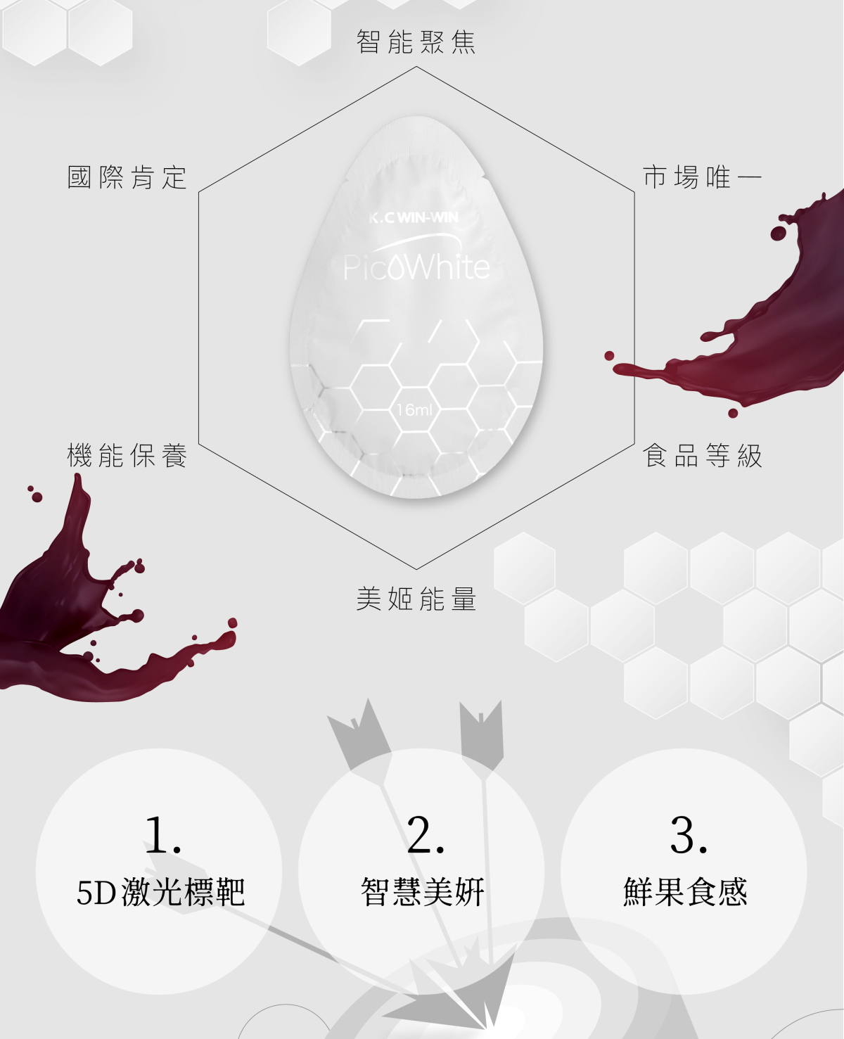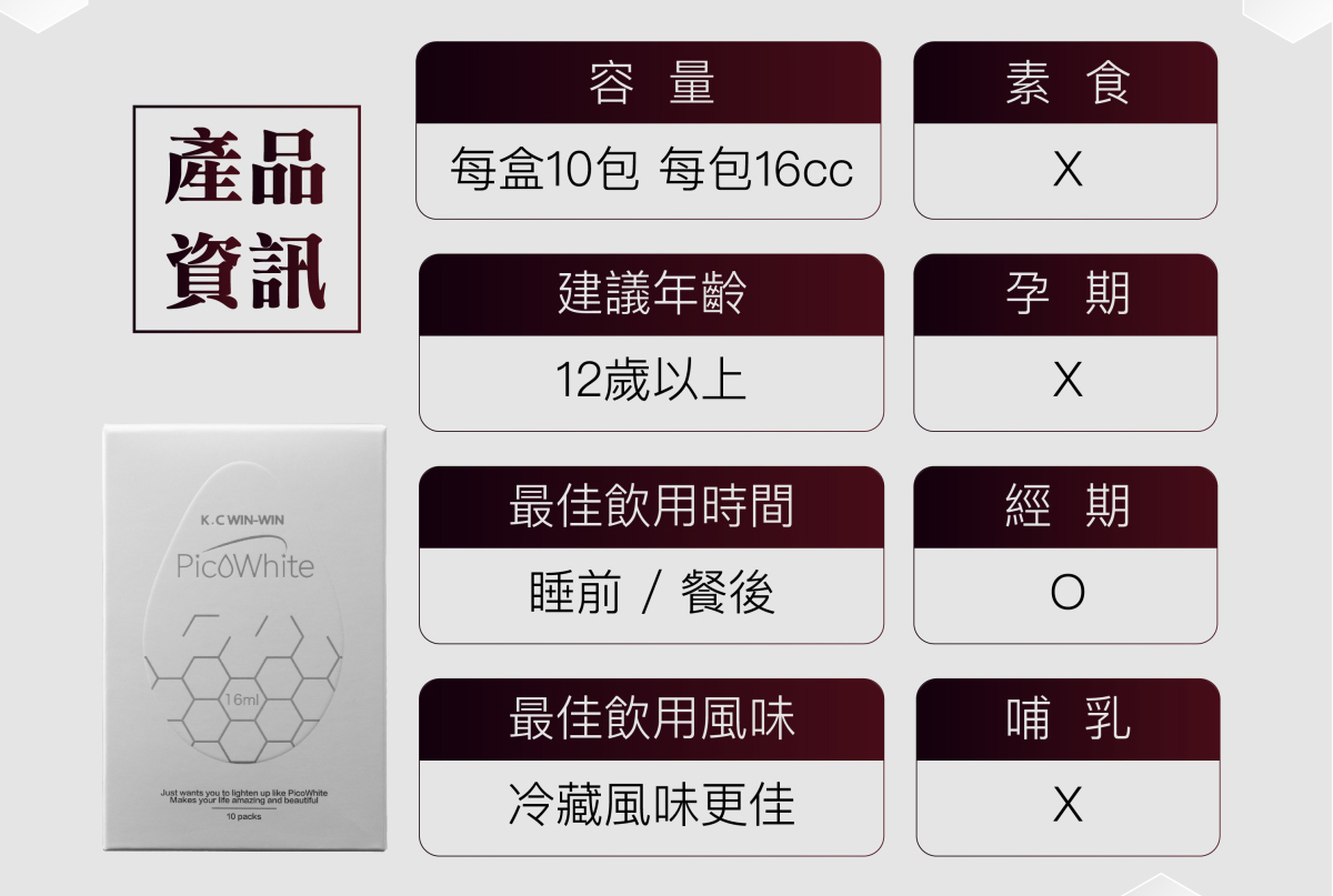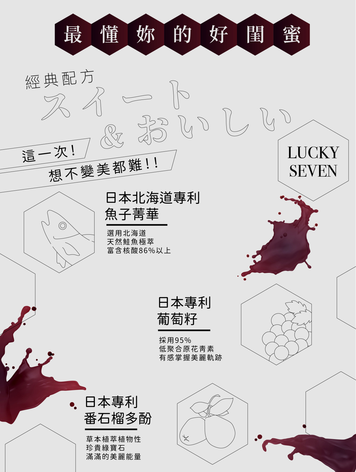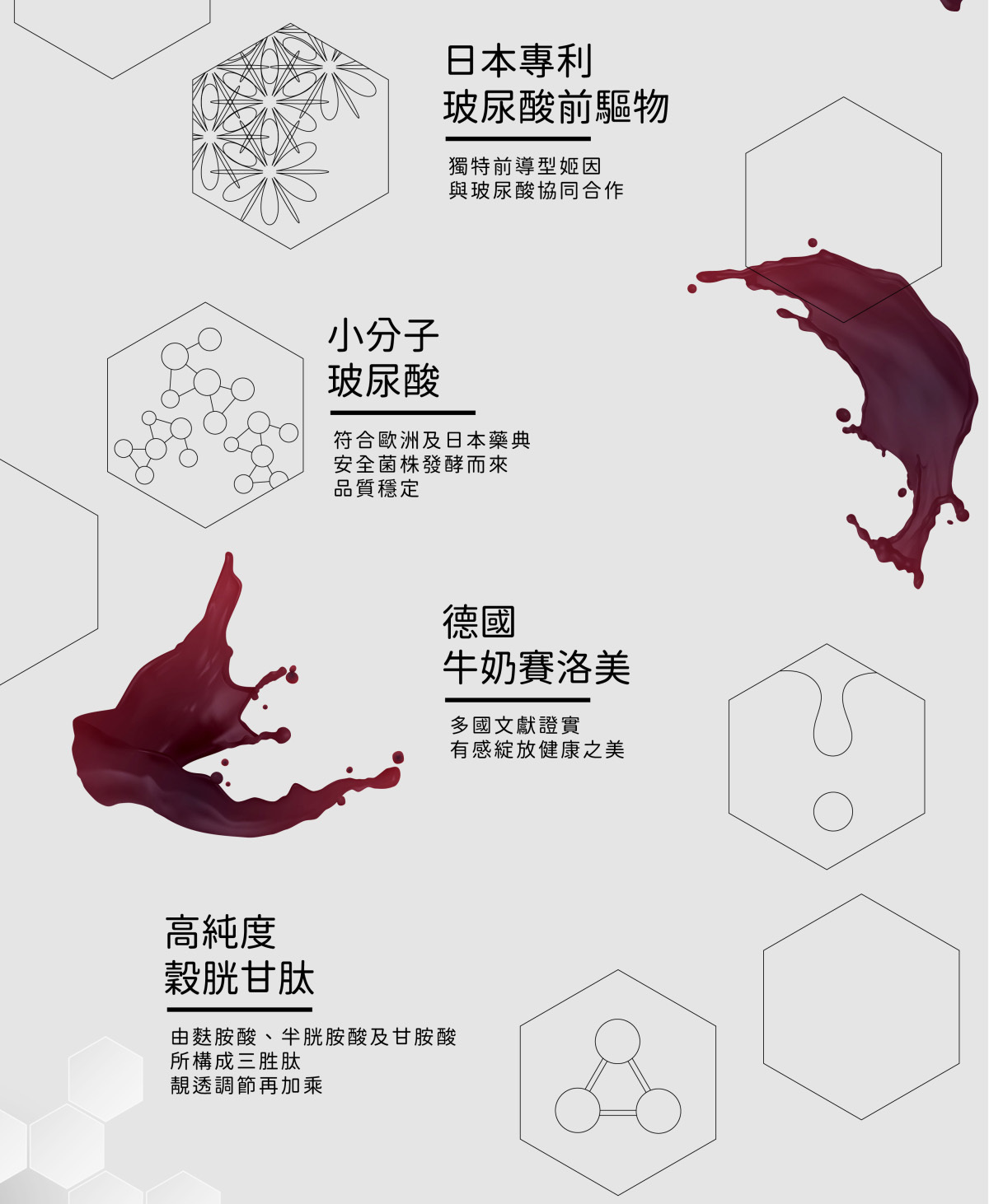 成分: 水、葡萄果汁粉(葡萄濃縮汁、麥芽糊精、玉米來源可溶性纖維、菊苣纖維、果寡醣、DL-蘋果酸、阿拉伯膠、檸檬酸、香料、海藻糖、葡萄皮萃取)、 鮭魚精巢萃取物、N-乙醯葡萄糖胺(糊精、水解幾丁質)、流行鏈球菌發酵物(含透明質酸鈉)、 穀胱甘肽、葡萄籽萃取物、鋅酵母、石榴萃取物、越橘萃取物(越橘萃取物、糊精)、 玄米萃取物、酵母粉(酵母粉、玉米澱粉)(含 β-菸醯胺單核苷酸 β-NMN)、珍珠粉、蔗糖素(甜味劑)