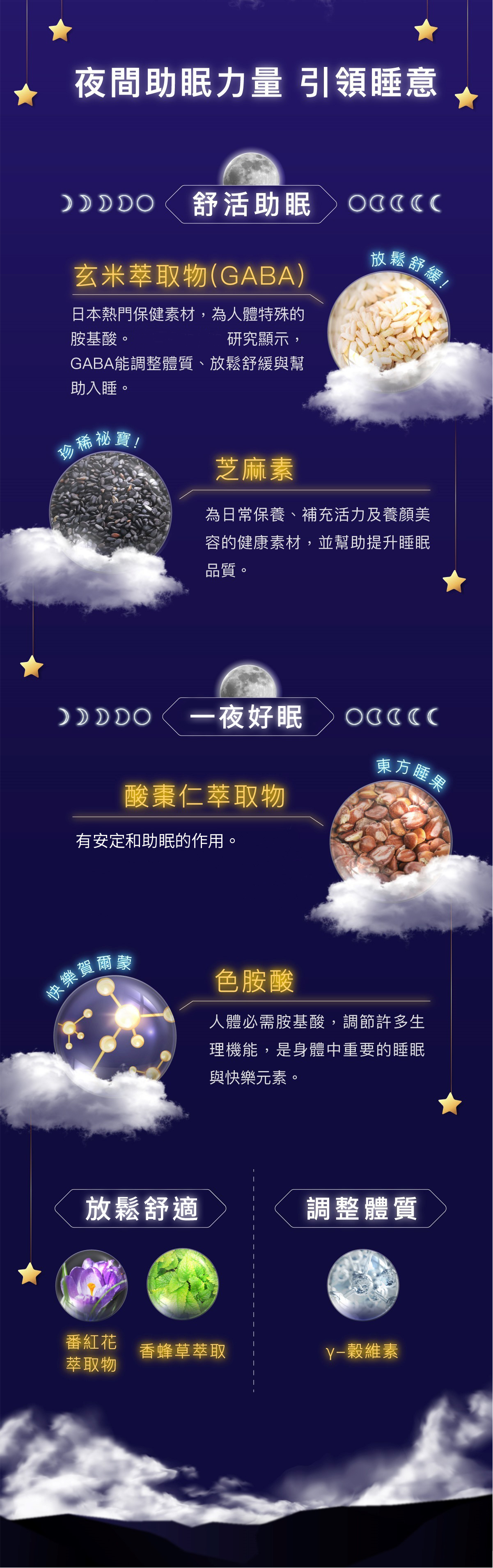 成分:玄米萃取物(含麩醯胺酸GABA)、酸棗仁萃取物、色胺酸、香蜂草萃取物、γ-穀維素、綠薄荷萃取物、番紅花萃取物、芝麻萃取物(芝麻素)、胡椒萃取物(胡椒鹼)、二氧化矽、硬脂酸鎂