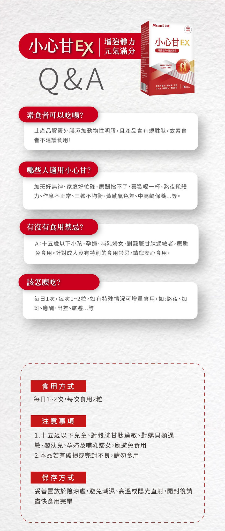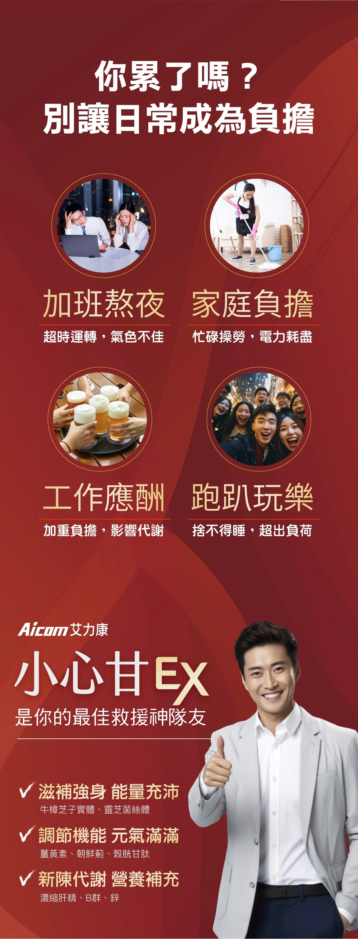 A:若有超時工作、應酬多丶體力活工作、作息不正常丶常熬夜、三餐不均衡、氣色體力不佳者都很推薦!沒有異常作息,但年紀過中高齡者,也都相當推薦食用小心甘當作日常保養。
