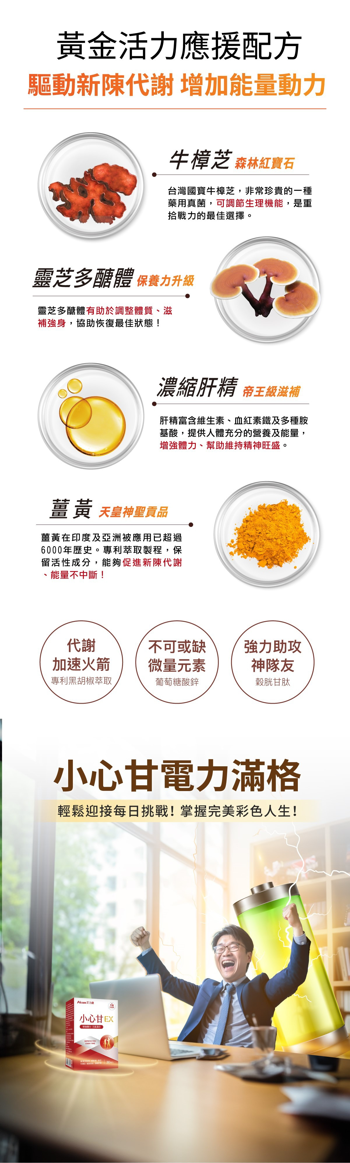 成分:薑黃萃取物(含薑黃素)、肝精(豬來源)、朝鮮薊萃取物、靈芝菌絲體萃取物、綜合維生素B群、牛樟芝子實體萃取物、圓酵母榖胱甘肽、葡萄糖酸鋅、胡椒萃取物(含胡椒鹼)、硬脂酸鎂、二氧化矽