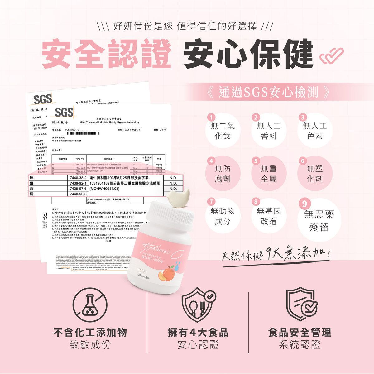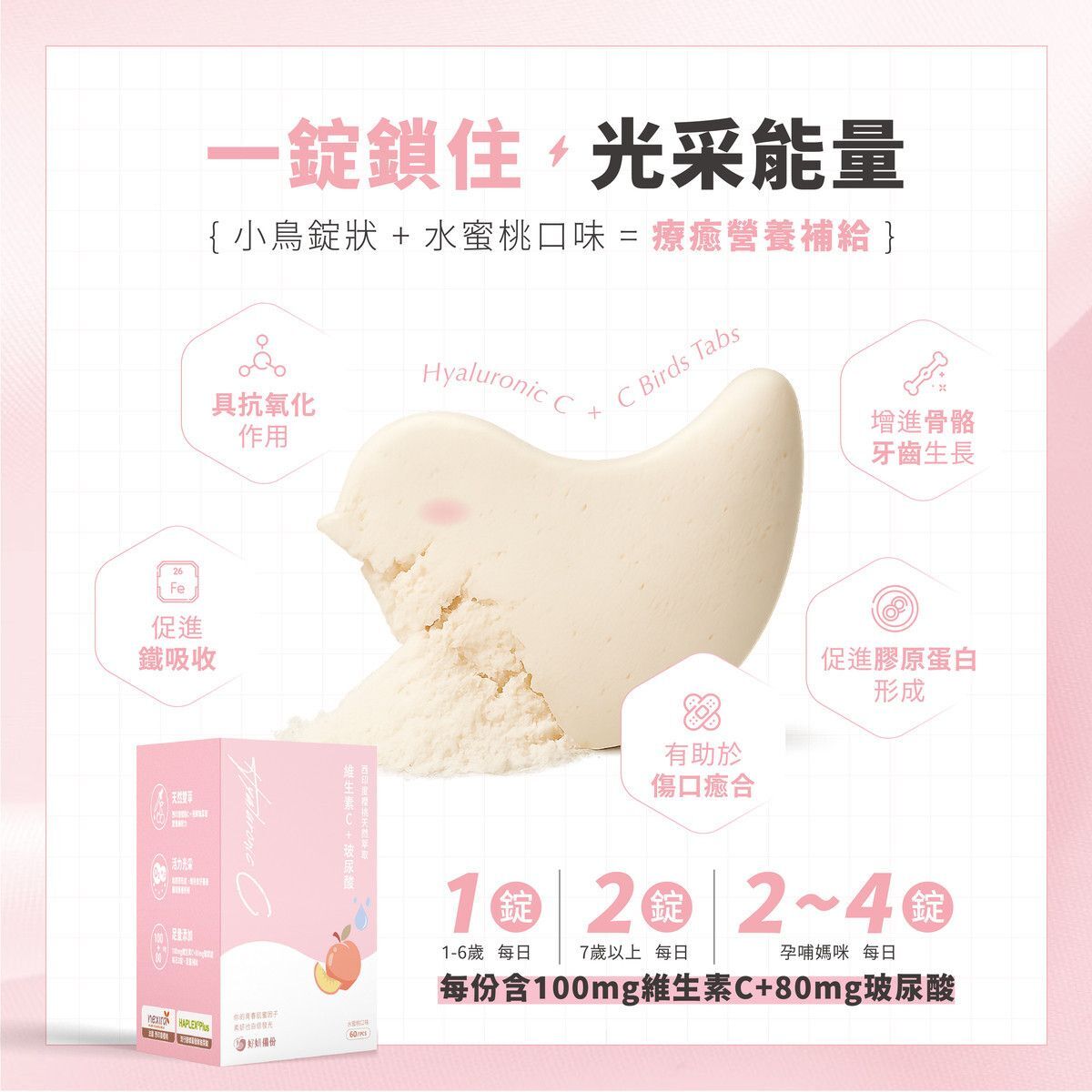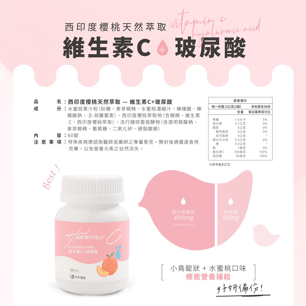 營養標示(2 錠/份):熱量 1.6 大卡,蛋白質 0.1 公克,碳水化合物 0.4 公克,糖 0.4 公克,鈉 1 毫克,維生素C 100 毫克,玻尿酸 80 毫克(每份量 2 公克/2 錠)