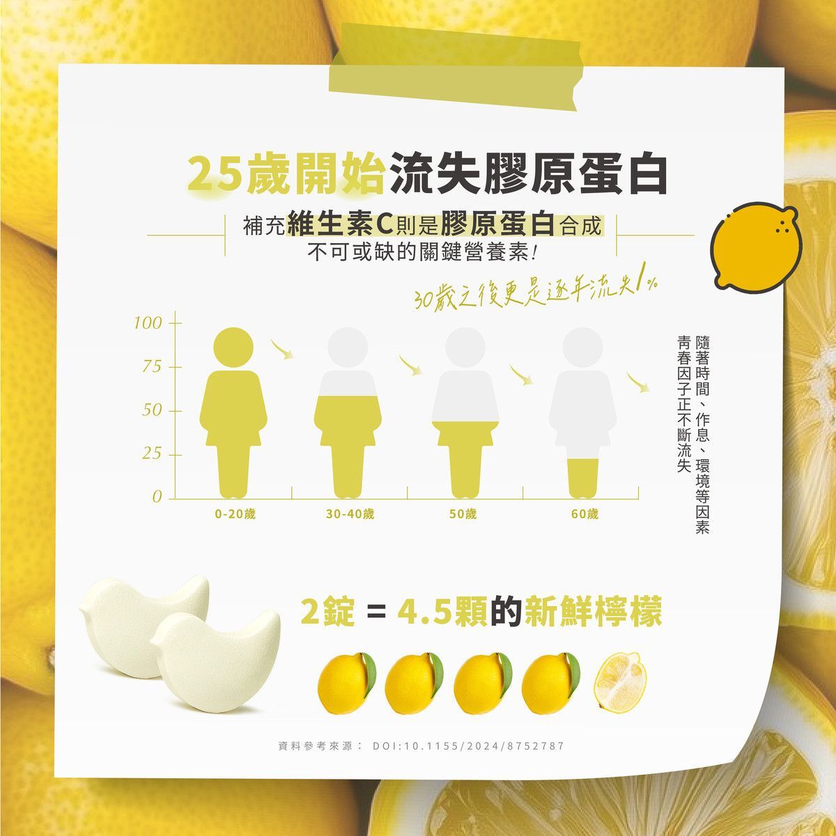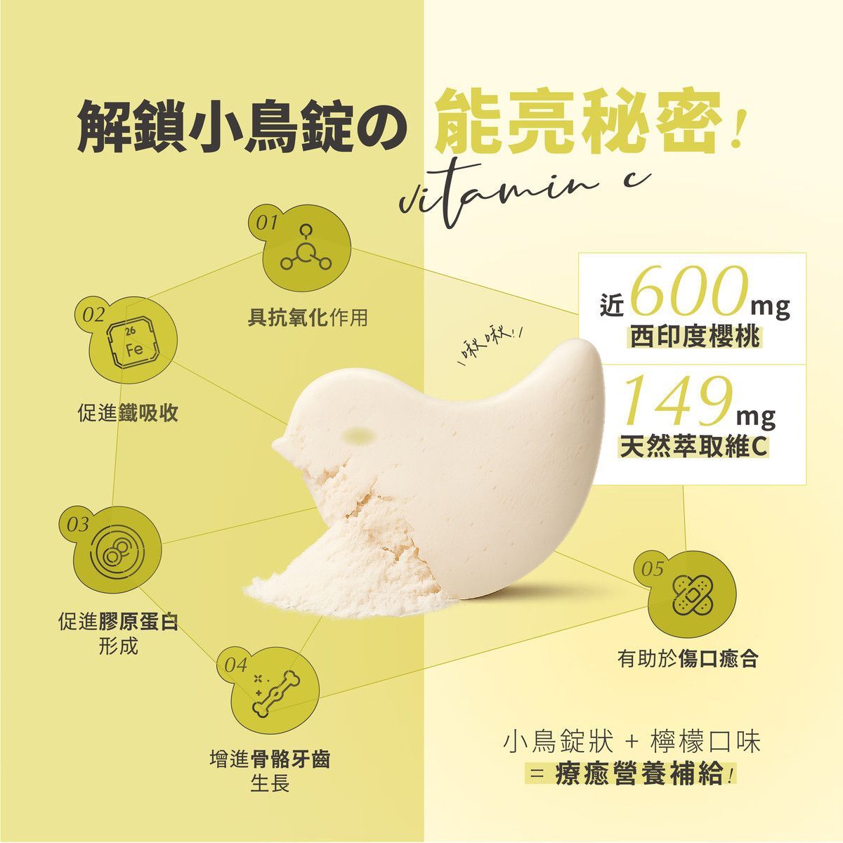 我們將維生素C 做成可愛小鳥錠狀,就是不想讓吃保健食品像吞藥一樣,而是期待每天的酸甜時刻(甜味來源為天然檸檬果汁)。