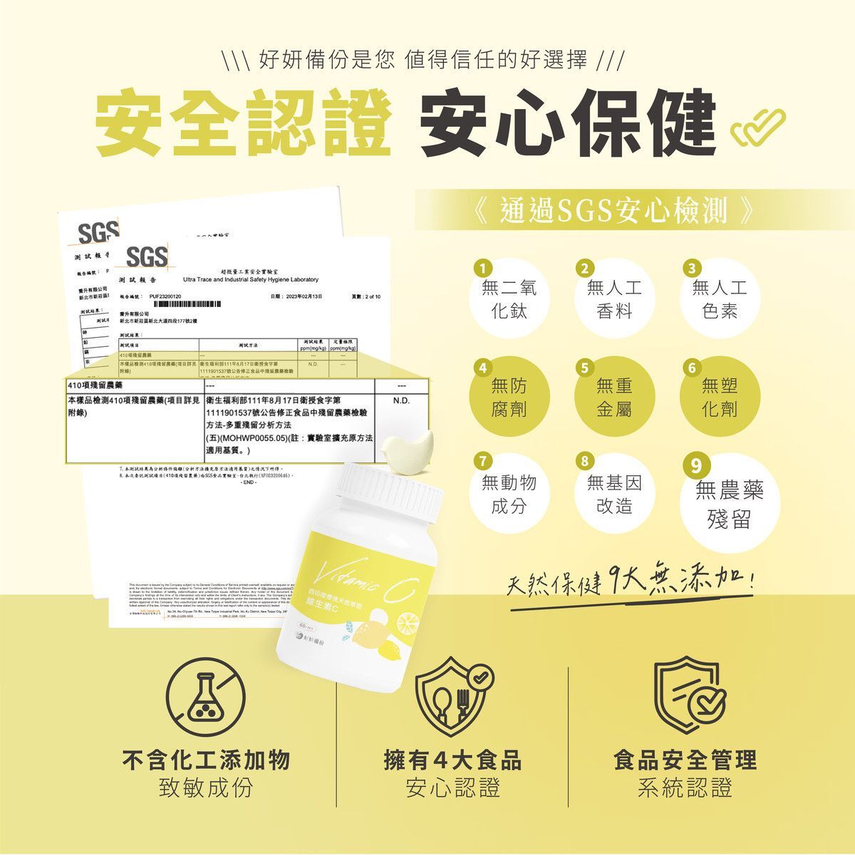 營養標示(2 錠/份):熱量 1.6 大卡,蛋白質 0.1 公克,碳水化合物 0.4 公克,糖 0.4 公克,鈉 1 毫克,維生素C 149 毫克(每份量 2 公克/2 錠)